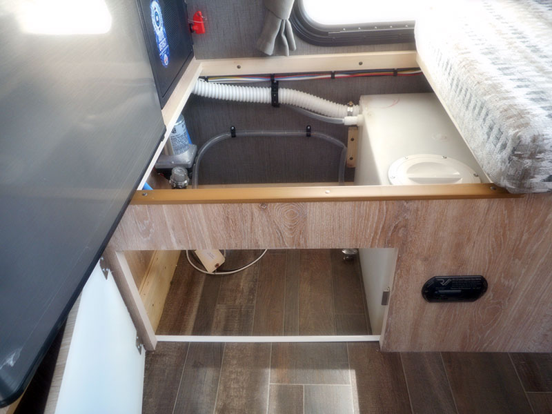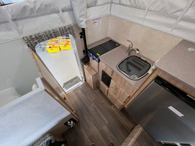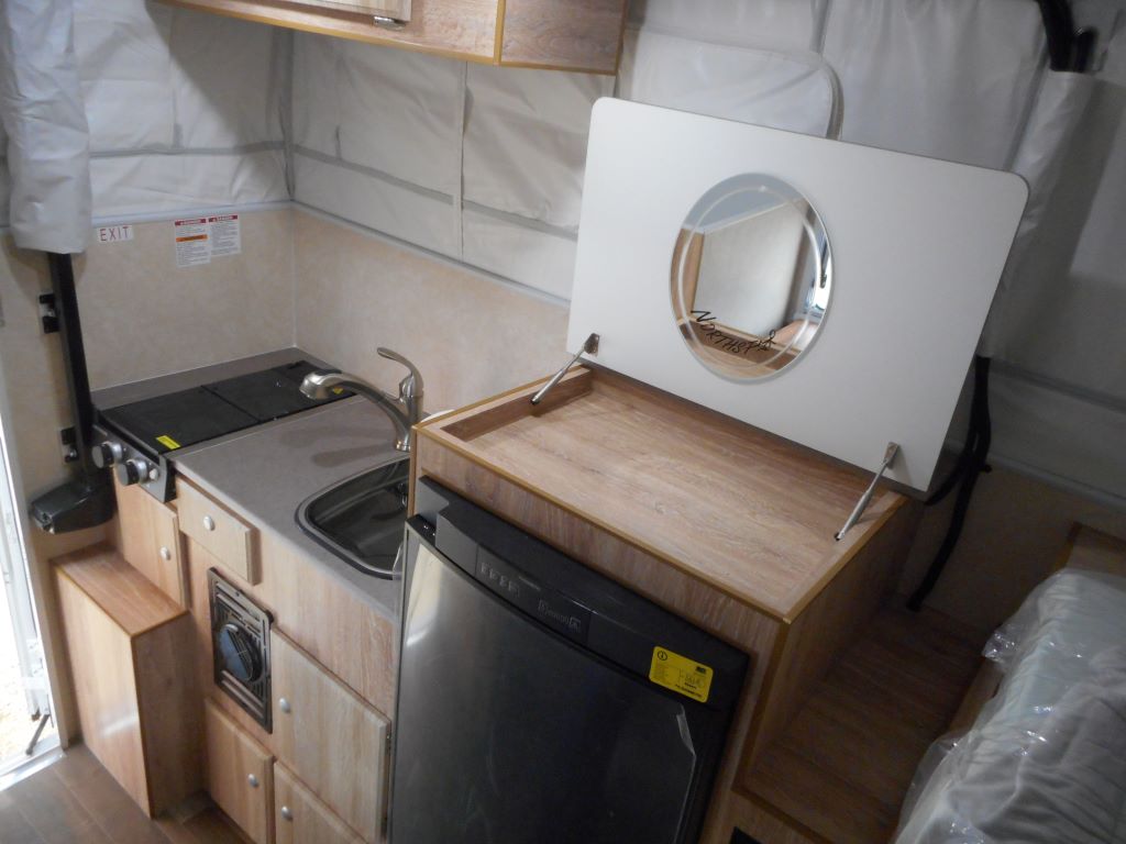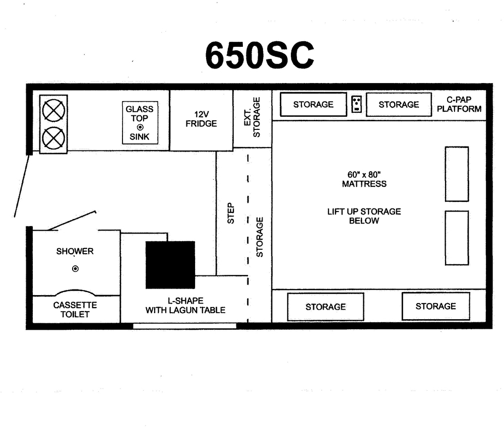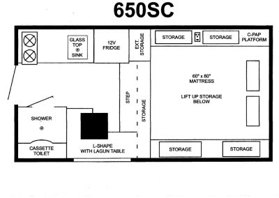 While being the same exterior dimensions (7’ Floor Length) as the previous 650SC model, this camper has been completely redesigned with a new floorplan, larger water capacity (30 gls), increased battery storage, new 2 burner slide-in folding glass top stove, new fridge and additional Std. features. Please click here to read the Truck Camper Magazine Review.