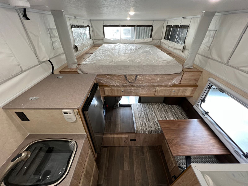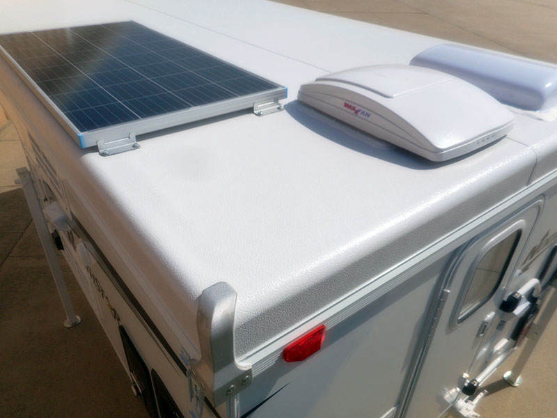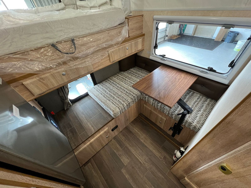 The extensive list of STD. Equipment includes, but is not limited to: 3.5 CF 12v Compressor fridge, 200 Watt Solar panel w/ Blue Tooth Module (11.10.2024), Auto ignition furnace, North/South extended cabover bed, Happijac (4220) Removable 4 Corner manual jacks, 2 Burner slide In folding glass top stove, Electric roof lift, insulated vinyl enclosure & dinette window, fiberglass exterior etc. A compact, self-contained camper for all those Ultra short bed and Standard short bed trucks out there!!