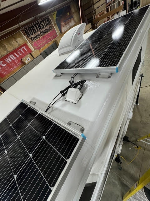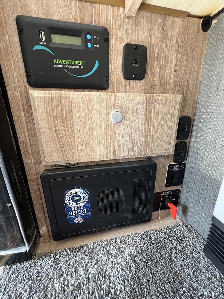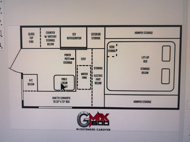 The Upgraded Electric System in the GMAX includes, but is not limited to: 3.5 CF 12v Compressor fridge, 6,000 BTU AC, 2 x 200 Watt Solar panel w/ Blue Tooth Module, Electric Infrared Heater w/Digital Thermostat, Dual Induction Electric Stove, 3,000 Watt Inverter, 280 Amp Hr. Lithium Battery and Electric Roof Lift.