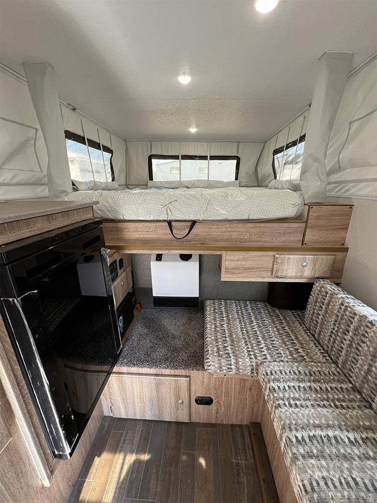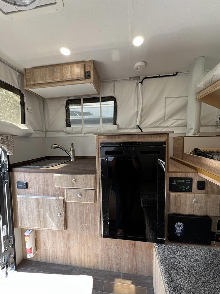 Designed to fit all of the smaller trucks such as Gladiator, Tacoma, Ranger, Frontier, Colorado and Canyon. This camper will not fit full size trucks, the correct model for full size trucks would be the G-MAX 650. The Upgraded Electric System includes, but is not limited to: 3.5 CF 12v Compressor fridge, 6,000 BTU AC, 2 x 200 Watt Solar panel w/ Blue Tooth Module, Electric Infrared Heater w/Digital Thermostat, Dual Induction Electric Stove, 3,000 Watt Inverter, 280 Amp Hr. Lithium Battery and Electric Roof Lift. All of the electronics in the G-Max 600 are designed to operate from the included 280 Amp Hr. Lithium Battery. An Optional 2nd Battery is available.