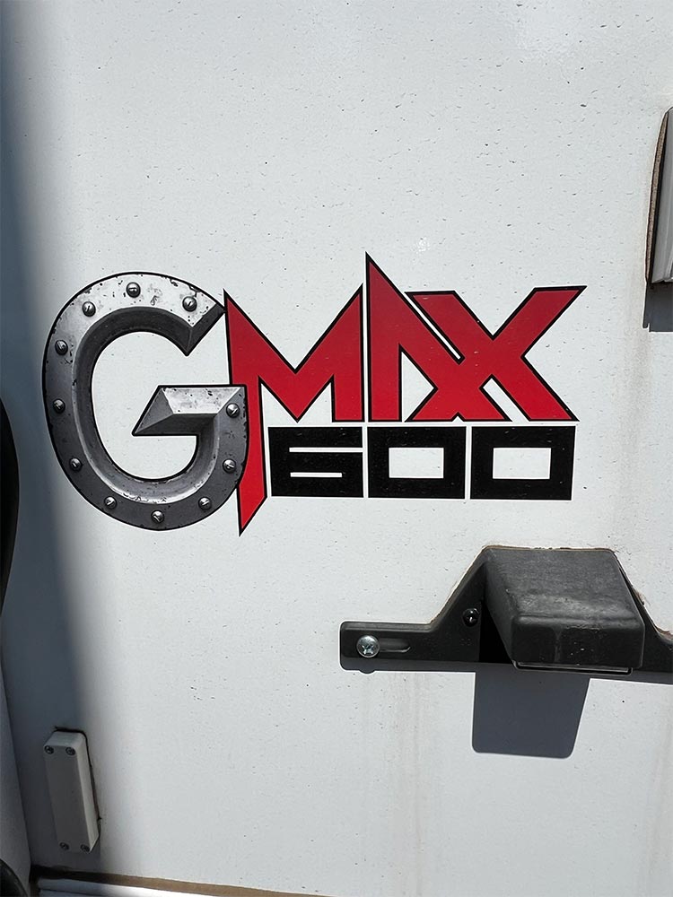 The G-MAX 600 has a base dry weight of 1360 lbs (with jacks) and comes equipped with upgraded water and insulation systems. Notable standard features include a gel/foam mattress, Lagun table system, and an acacia wood countertop, with various options and accessories available for further customization.