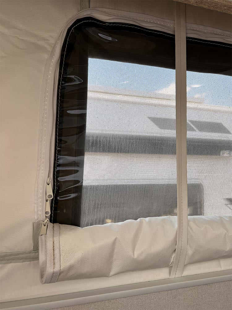 Comfort on the Outside, Too. Insulated windows with screens and shades provide climate control while keeping bugs out. The extended cabover with side cabinets ensures ample storage, while the sleek fiberglass siding and LED lighting offer a modern look that complements its rugged capabilities.