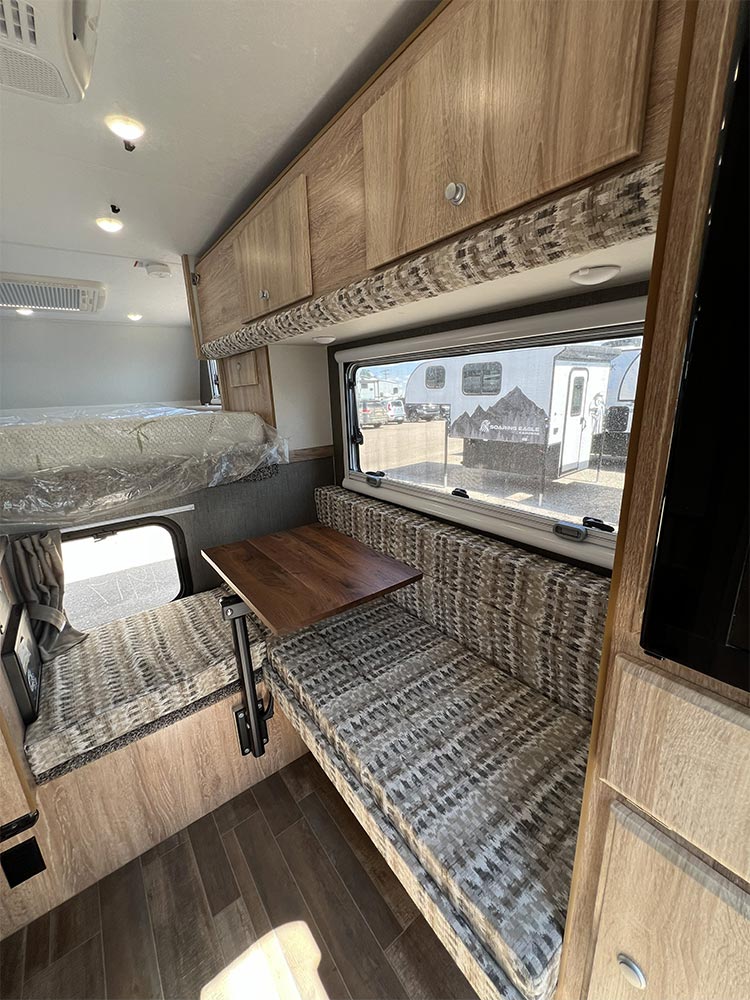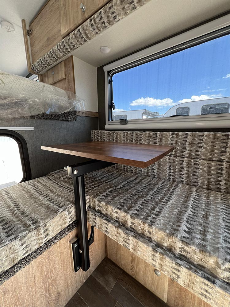 23. Fold down bunk/cabinet above dinette (26″ x 77″) with 2 doors and restraint net (38 lbs): $435.00