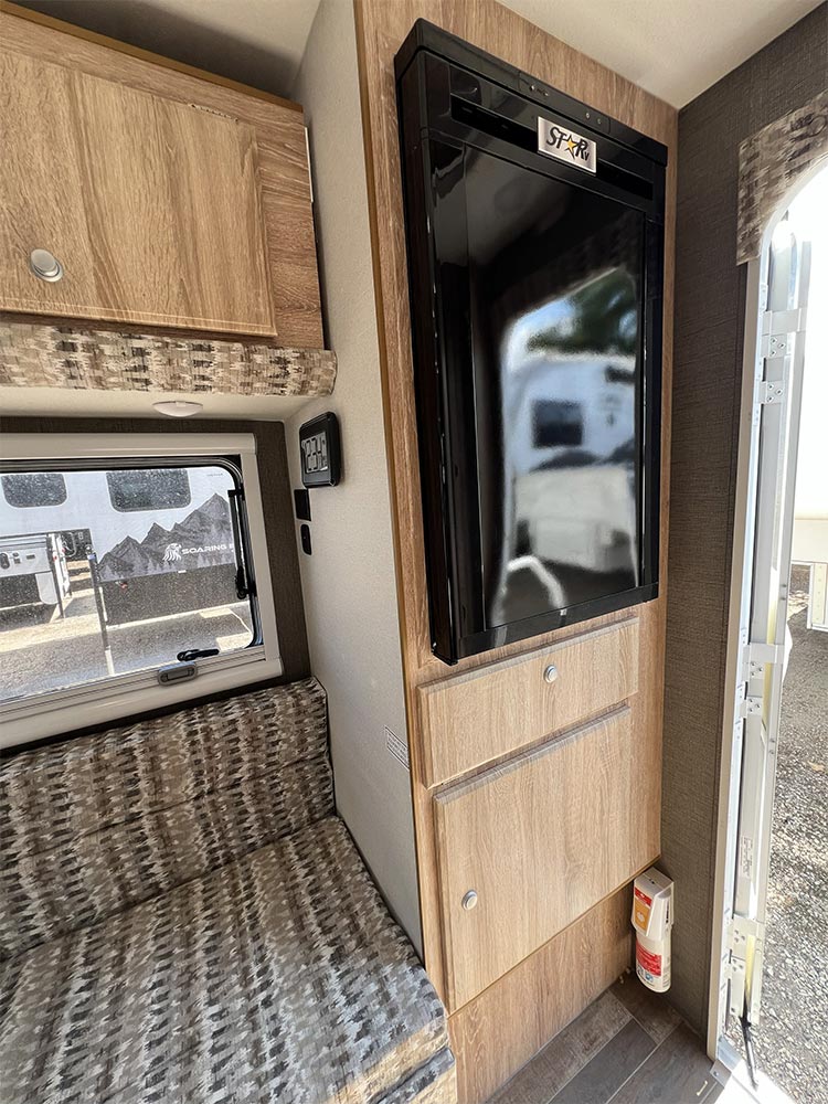 Equipped with premium features found in larger models, the Liberty includes a 3.5 cu. ft. compressor refrigerator, 200-watt solar panel, interior/exterior showers, LED lighting, and a “SureSleep” 6″ gel/foam mattress.