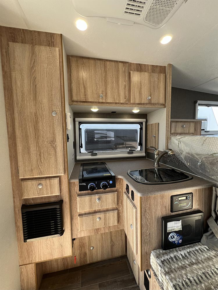 Fits both ultra short beds (5’6″ to 5’10”) and standard short beds (6’4″ to 6’10”). Despite its compact size, it still has many of the standard features including extended cabover with a Queen sized bed, insulated windows, and more!