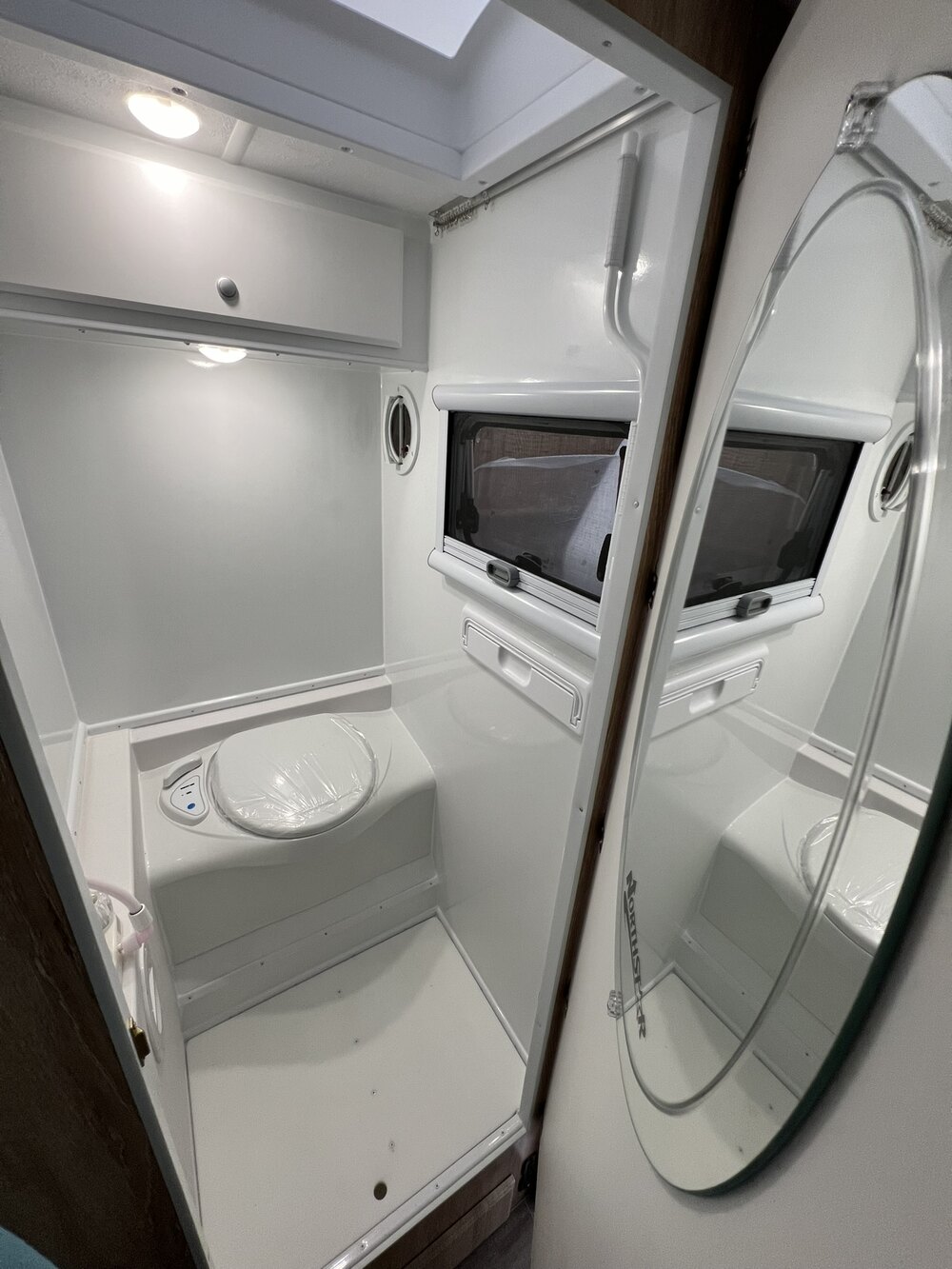 Interior Bathroom w/ Shower, Cassette Toilet, Overhead Cabinet, 12v Push Out Fan & Skylight