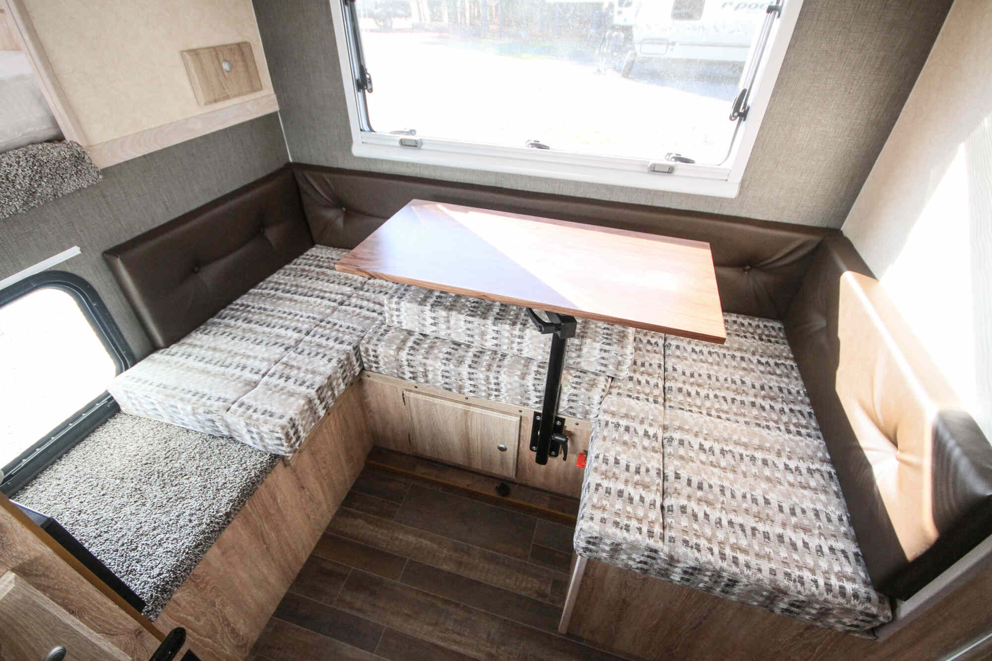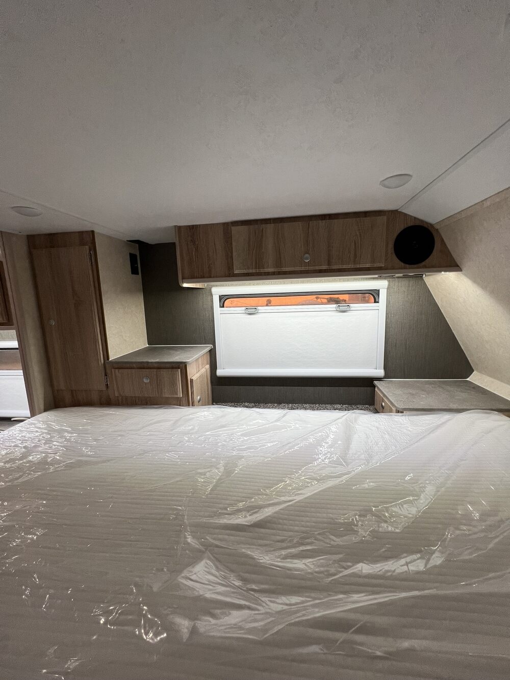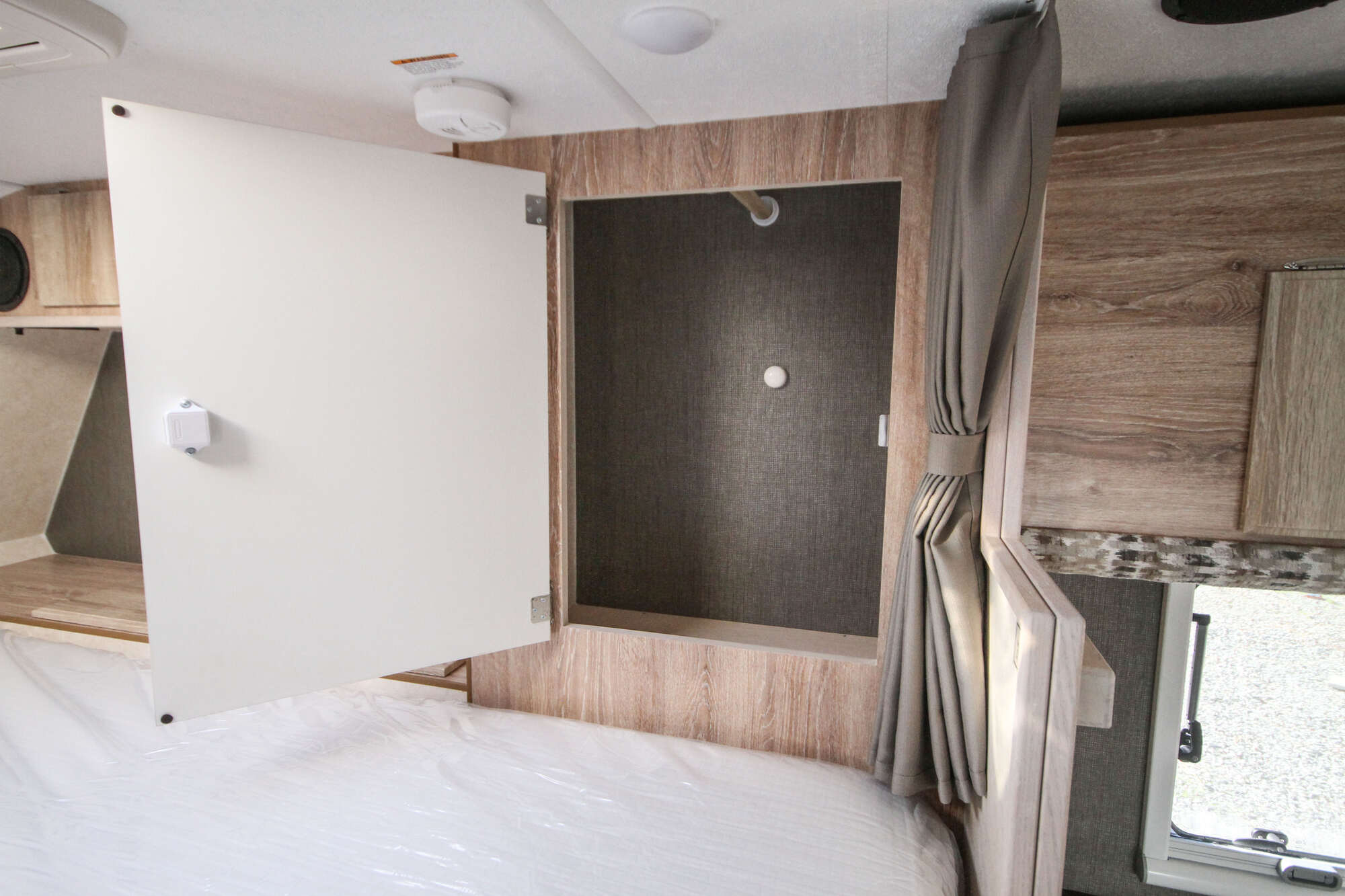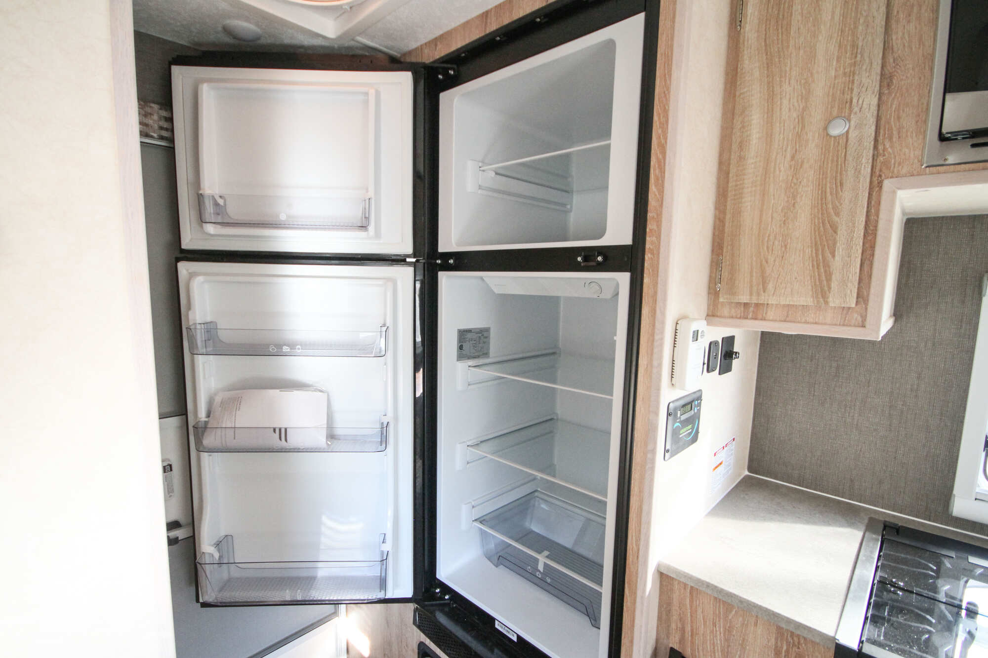 Enjoy luxury living on the road with the Night Hawk’s luxurious interior. It boasts a 10 cu. ft. double-door refrigerator, 6’8″ interior height, a 20K BTU furnace, and a private bathroom with a shower, cassette toilet, and skylight.
