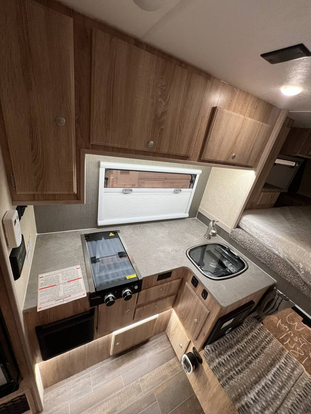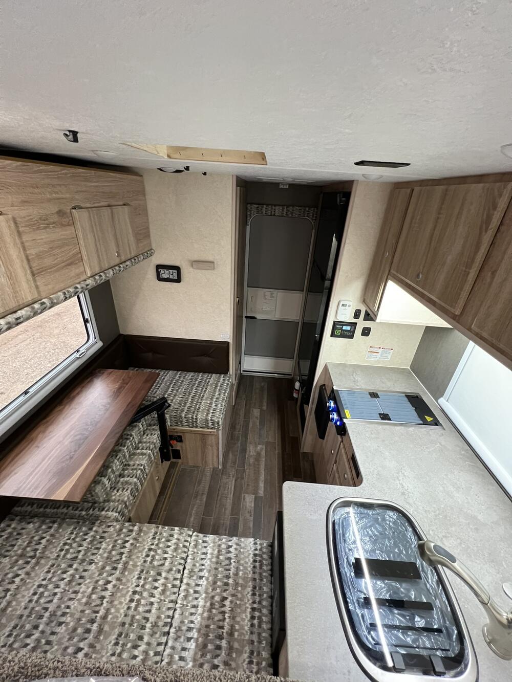 This model is equipped with a robust power system, featuring 350 watts of solar with a Bluetooth controller, dual 20 lb. LPG tanks, and a 45-amp lithium/AGM-ready power converter. Its exterior is built for durability and functionality