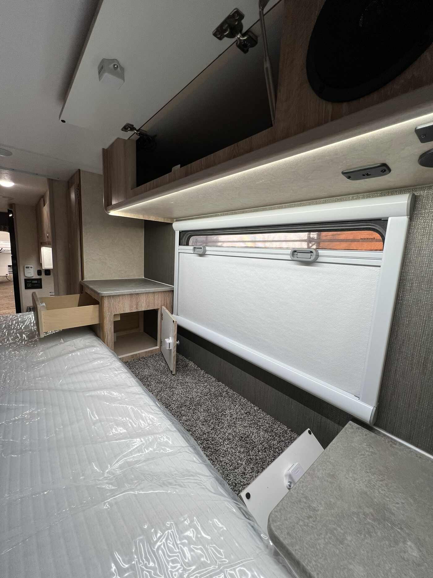 Comfort on the Outside, Too. Insulated windows with screens and shades provide climate control while keeping bugs out. The extended cabover with side cabinets ensures ample storage, while the sleek fiberglass siding and LED lighting offer a modern look that complements its rugged capabilities.